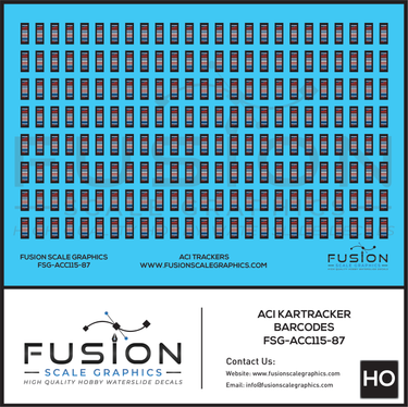 Enhance the realism of your railroad layout with Fusion Scale Graphics' ACI KarTrack Barcodes System Decal Set. Elevate your modeling projects and bring authenticity to every aspect of your HO Scale 1:87 railroad models.