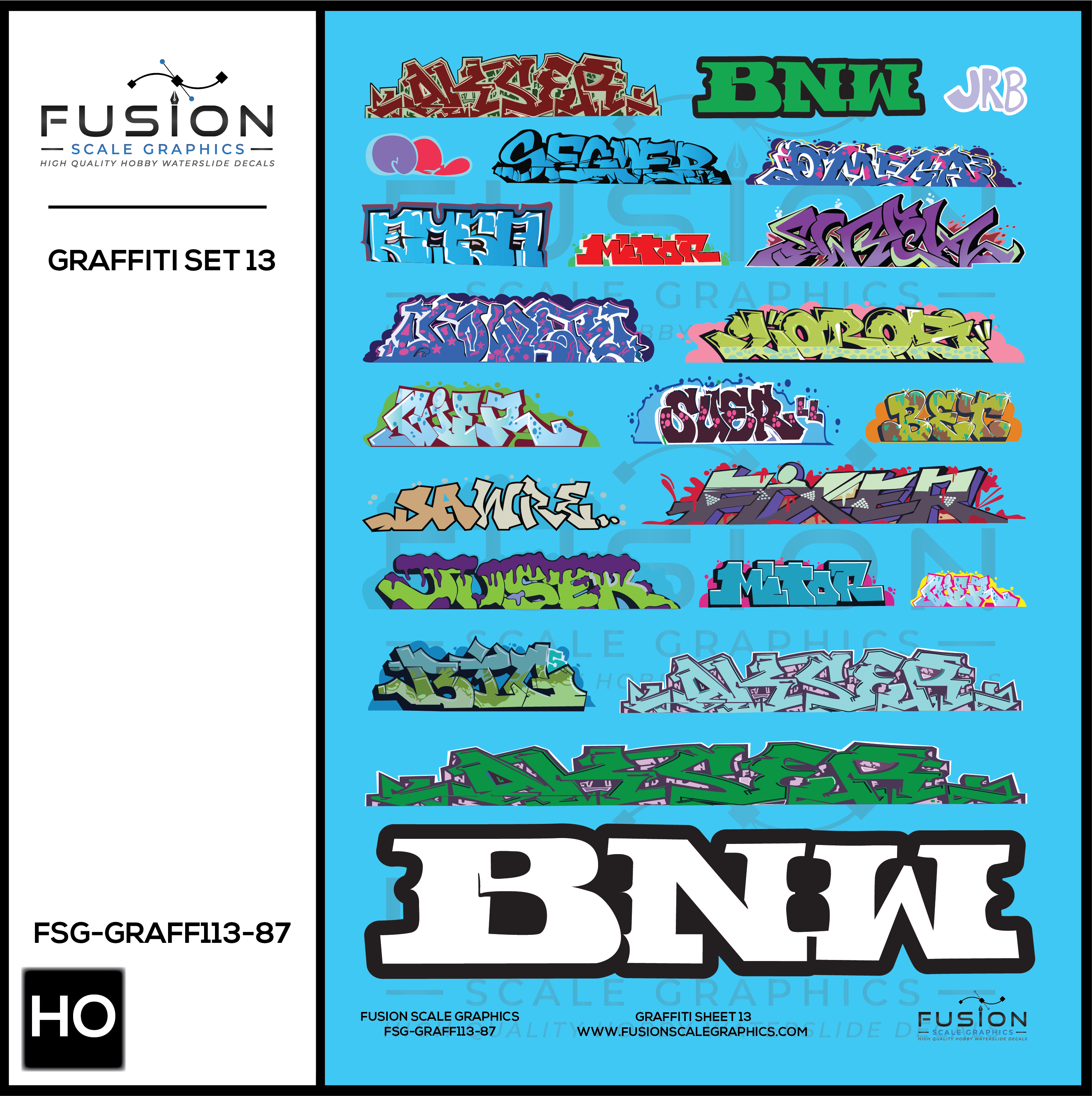 Graffiti decals work great on your freight cars, buildings and many other items across your layout. Our top of the line graffiti decals are printed with a white backing on a clear decal film, this white backing allows the decal to be placed over dark colors (including black). With the ability to print and control where white is printed our decals are not printed on a white decal film.