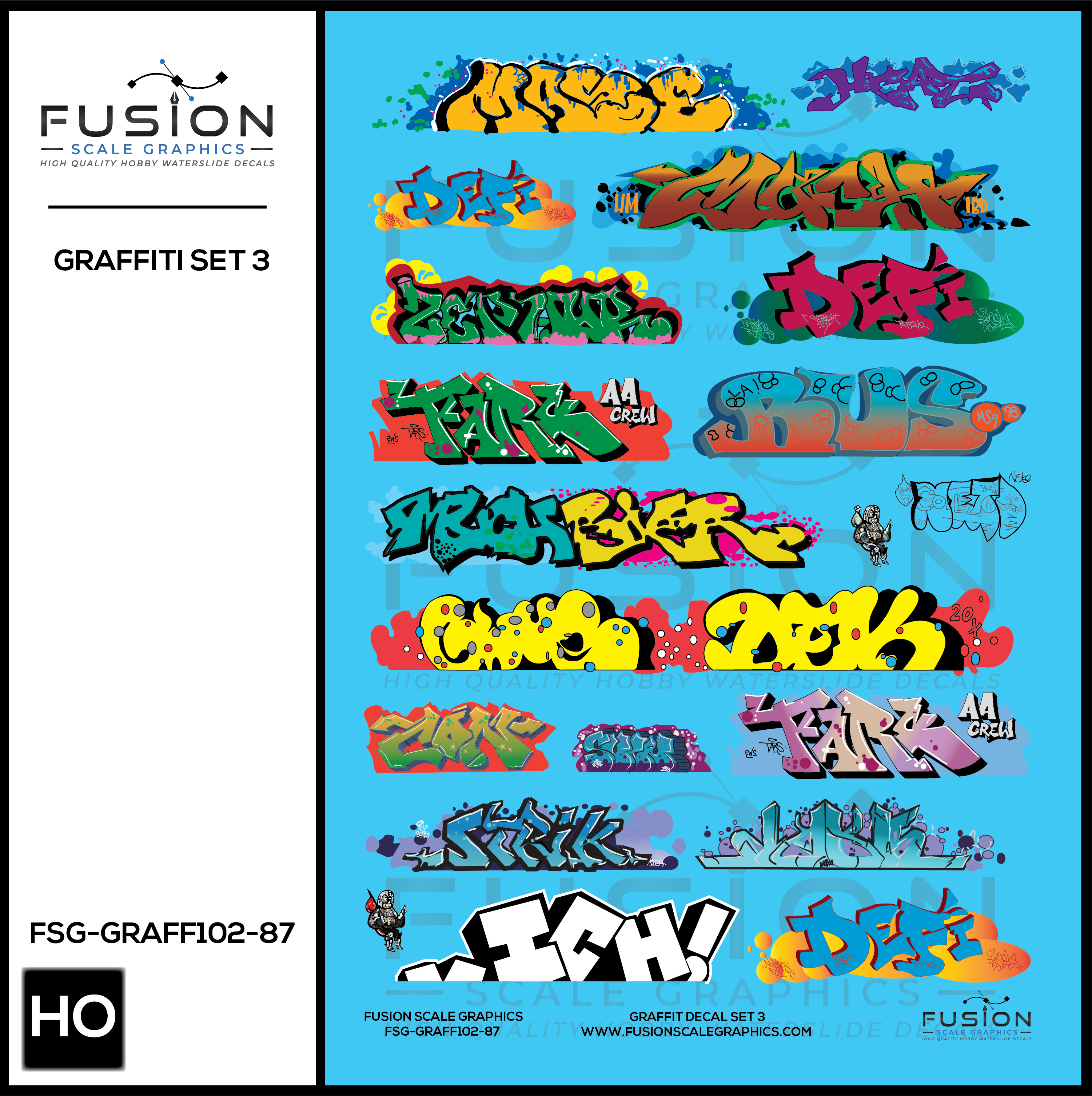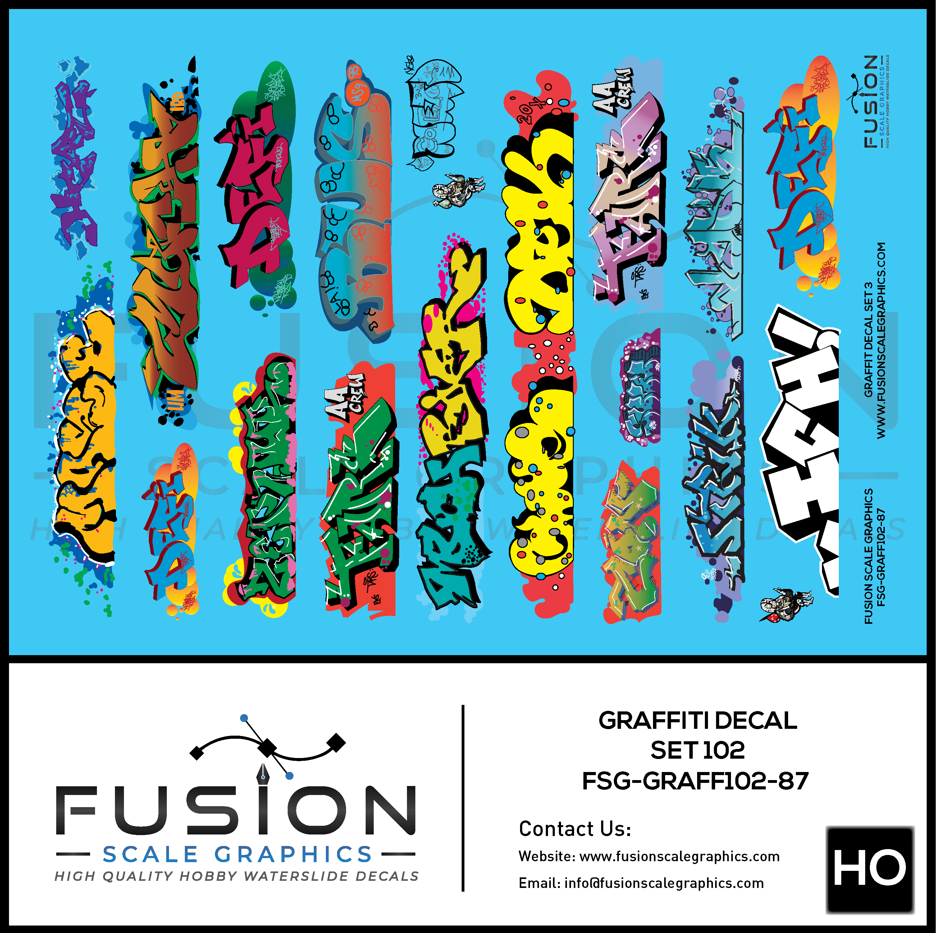 Graffiti decals work great on your freight cars, buildings and many other items across your layout. Our top of the line graffiti decals are printed with a white backing on a clear decal film, this white backing allows the decal to be placed over dark colors (including black). With the ability to print and control where white is printed our decals are not printed on a white decal film.
