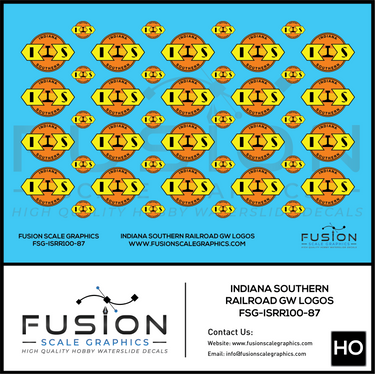 Indiana Southern Railroad logos for the Genesee & Wyoming version of the railroad. Logos will fit GP and SD style locomotives. Pair with our Genesee & Wyoming stripes, numbers and more to complete your fleet. These logos can also be used around the layout for various buildings, cars and more.