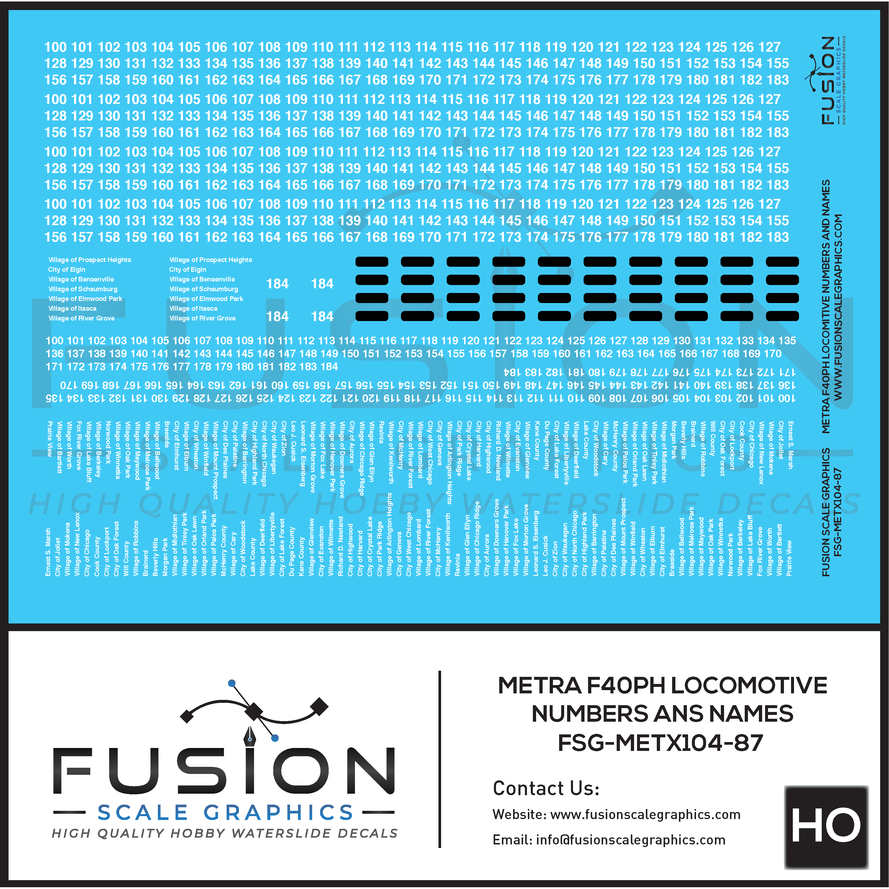 HO Scale Metra EMD F40PH Locomotive Numbers and Names Decal Set.