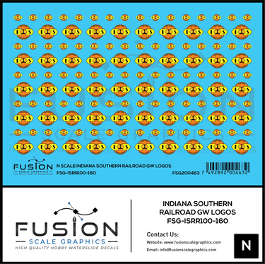 Indiana Southern Railroad logos for the Genesee & Wyoming version of the railroad. Logos will fit GP and SD style locomotives. Pair with our Genesee & Wyoming stripes, numbers and more to complete your fleet. These logos can also be used around the layout for various buildings, cars and more.