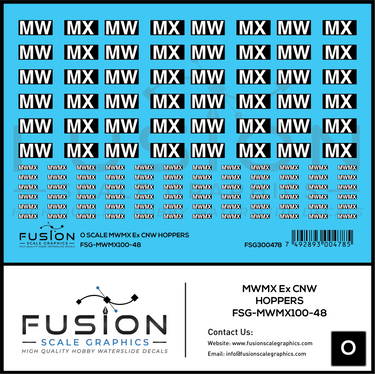 Decal set includes just the MWMX white lettering on black patch for the car sides and car ends. Commonly found on ex CNW yellow or green covered hoppers, prototypes feature several styles of previous numbers or stencils from previous owner’s post CNW.