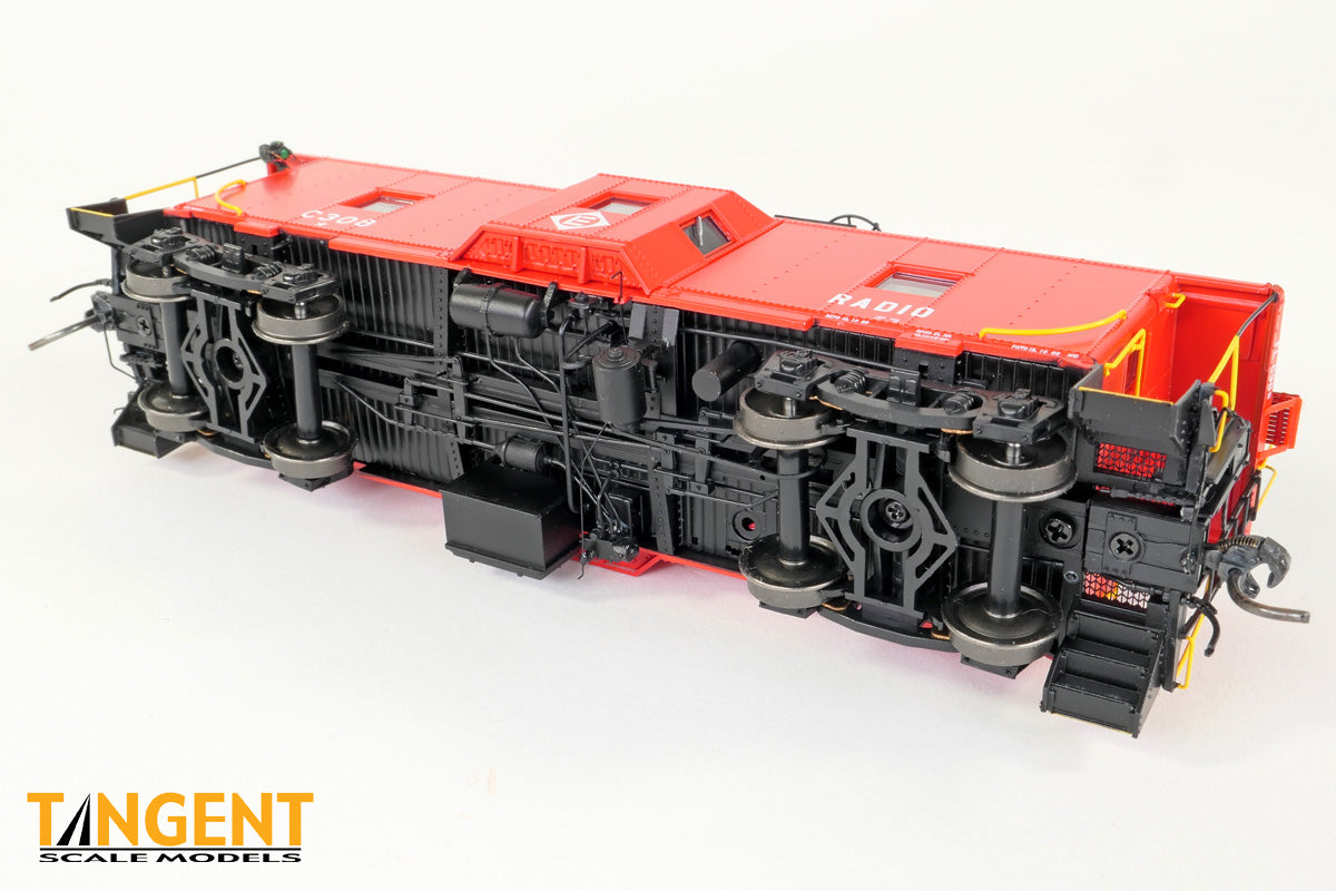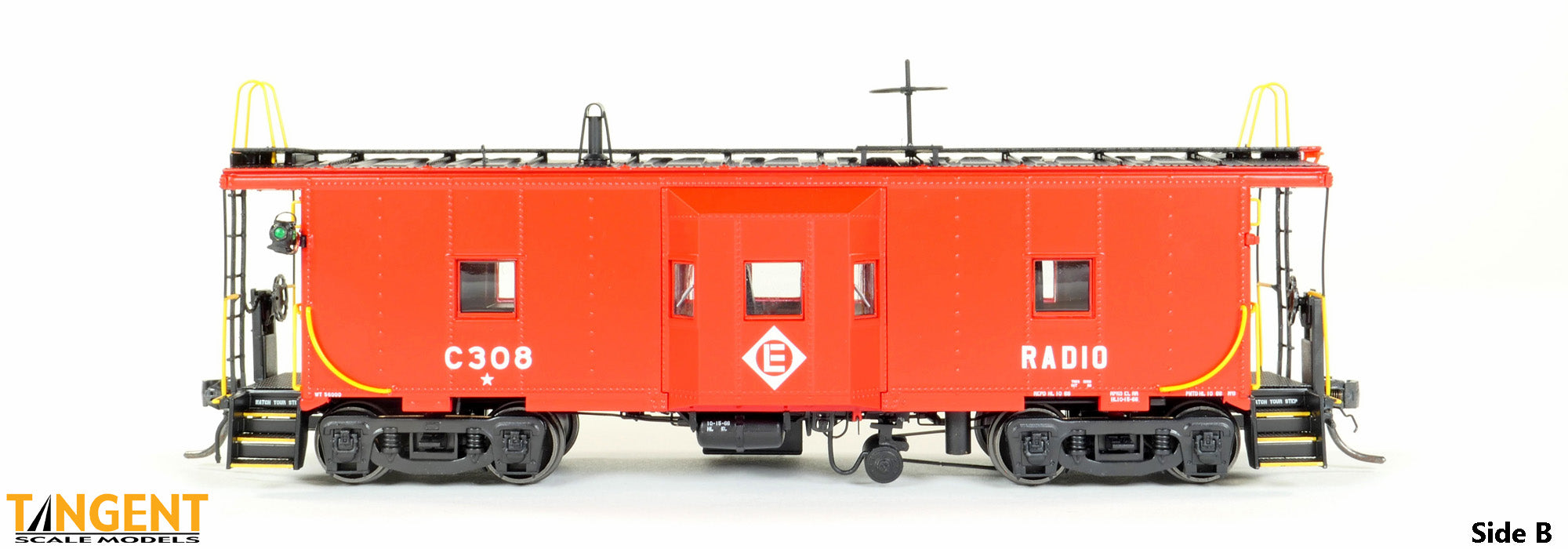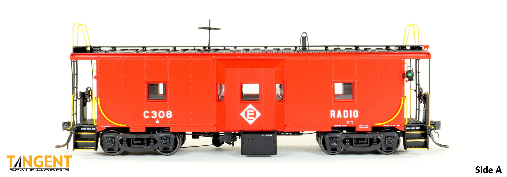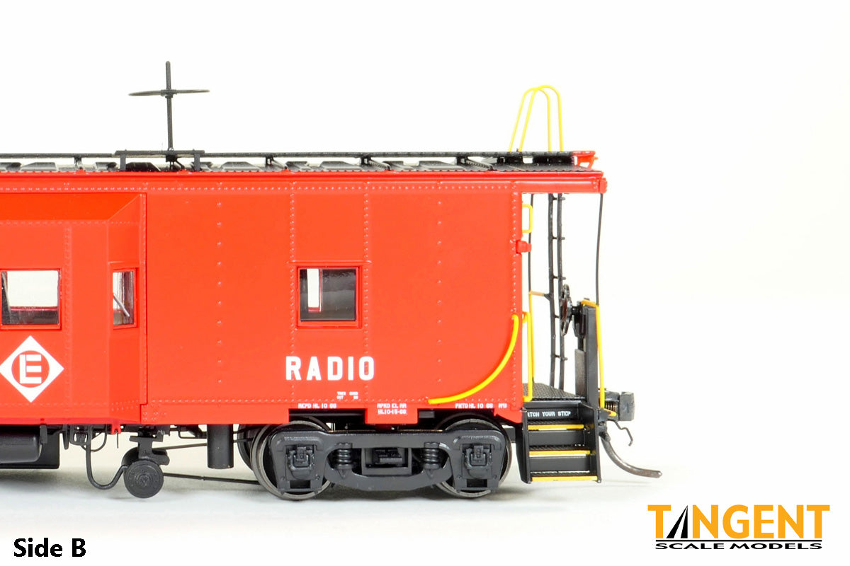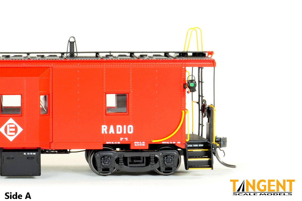 – Erie Lackawanna (EL) “Simplified Repaint 1966” w/ Interior Lights and Lit End Lanterns gives modelers an example of the solid-red EL repaint scheme from 1966. The entire body and sill are painted Safety Red, with a black roof and walkway. The underframe and steps are black. The Erie Lackawanna diamond logo is applied to the face of the bay window. Off to the right is the condensed “RADIO” lettering denoting the caboose is equipped with a radio for crew communication. On the roof, the wagon wheel antenna stands tall with a detailed smoke jack nearby. The underside is loaded with details: full brake rigging, battery box, relocated toilet dump pipe and a low hanging generator with cables and axle belt. The ends feature an accurate Miner brake wheel, separately applied coupler cut levers and train line air hoses. The model rides in Tangent’s All-New General Steel Casting “Express” trucks with 33″ standard .110” tread CNC wheels. The caboose has a fully-painted green/black ICC applied interior. For lighting, this Tangent EL Repaint is equipped with “golden” interior lights, mimicking the incandescent bulbs of the real cabooses along with lit corner lanterns with red and green lenses on one end. A wand is included to operate the lights – easy with no fuss! We are offering our EL “Simplified Repaint 1966” scheme in 6 numbers. Each car number features accurate car body number, RADIO lettering spacing and positioning based on photos. For the EL fans paying attention: Yes, each car has varying placement and different month and day data in the IDT, paint code, inspection, truck changeout and REPACK stencils from the EL’s Hornell, New York shop in 1966. Stepwell data and end reporting mark placement on each individual model also vary by car number. It’s these little details that make cabooses so interesting – every repaint is different!