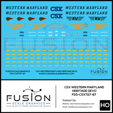 Bring the powerful and historic CSX 1852 W&M Western Maryland Heritage ES44AH locomotive to your HO scale railway! This decal set includes all the intricate details and markings to make your model truly stand out. Showcase your passion for trains with this high-quality decal set.
