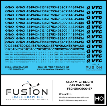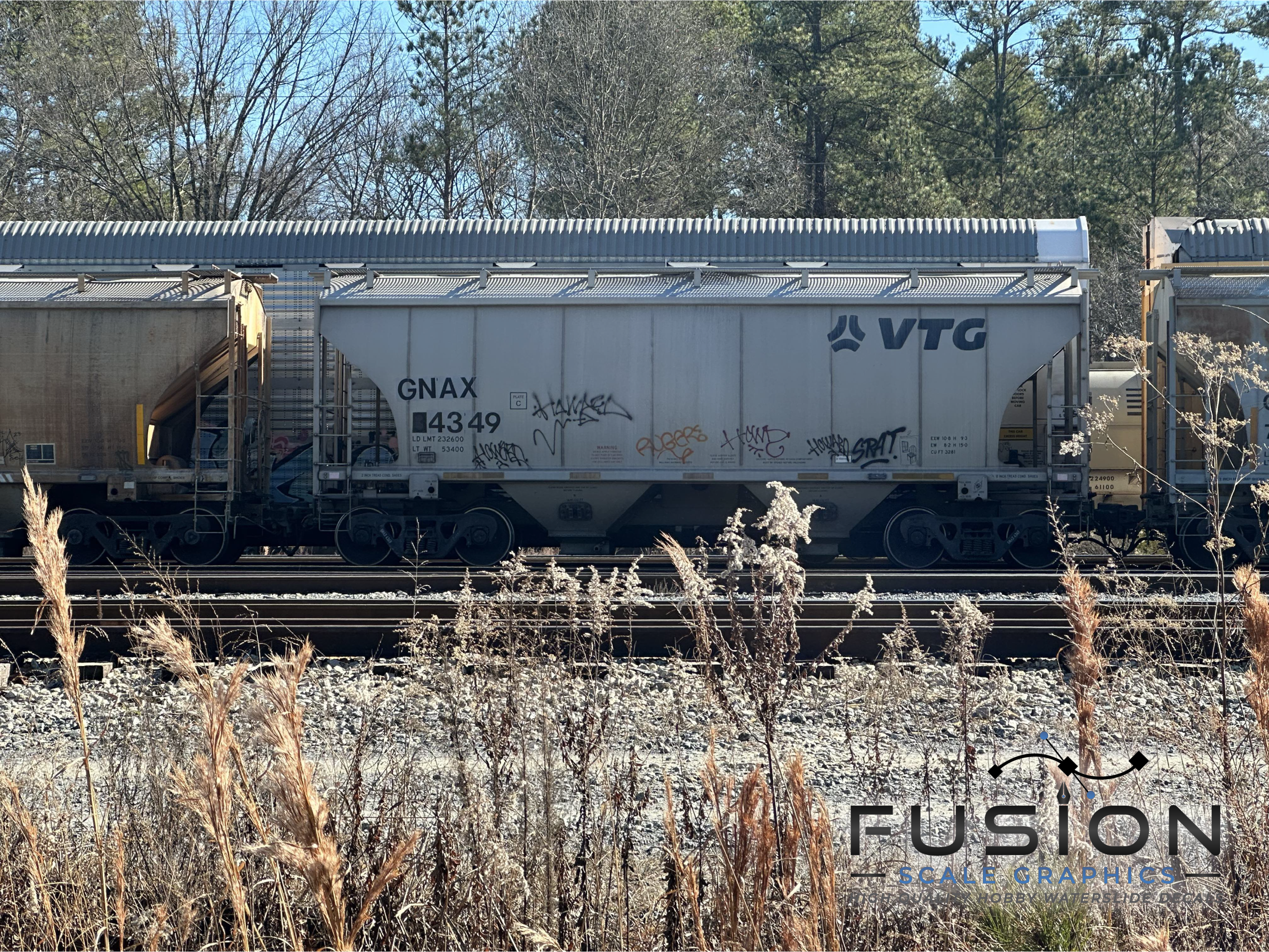 Looking to model the GNAX VTG 2-Bay covered hoppers? Our GNAX VTG set is just what you need to patch the Walthers Mainline VTG hoppers, or if you have a non VTG 2-bay car our decal set features the VTG logo as found on the top right of the cars.