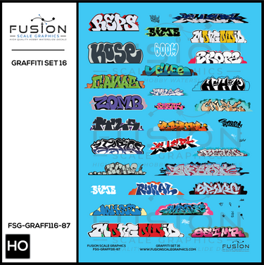 Graffiti decals work great on your freight cars, buildings and many other items across your layout. Our top of the line graffiti decals are printed with a white backing on a clear decal film, this white backing allows the decal to be placed over dark colors (including black). With the ability to print and control where white is printed our decals are not printed on a white decal film.