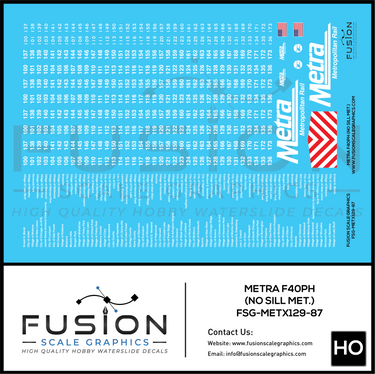 HO Scale Metra F40PH Metropolitan Rail Locomotive Decal Set