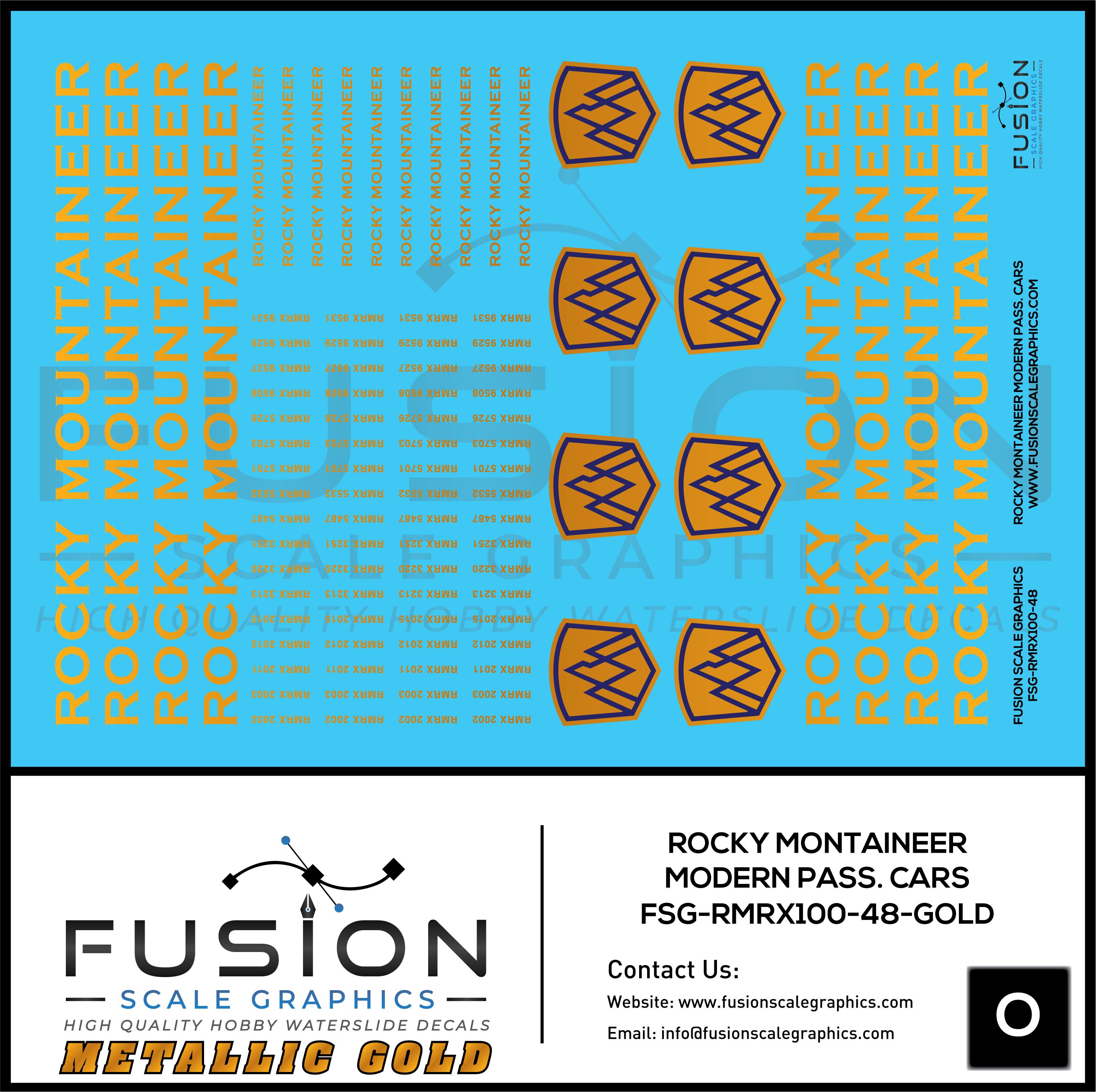 Metallic Gold O Scale Rocky Mountaineer Modern Passenger Cars Decal Set
