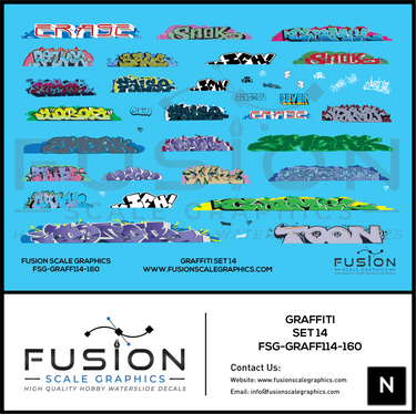 Graffiti decals work great on your freight cars, buildings and many other items across your layout. Our top of the line graffiti decals are printed with a white backing on a clear decal film, this white backing allows the decal to be placed over dark colors (including black). With the ability to print and control where white is printed our decals are not printed on a white decal film.