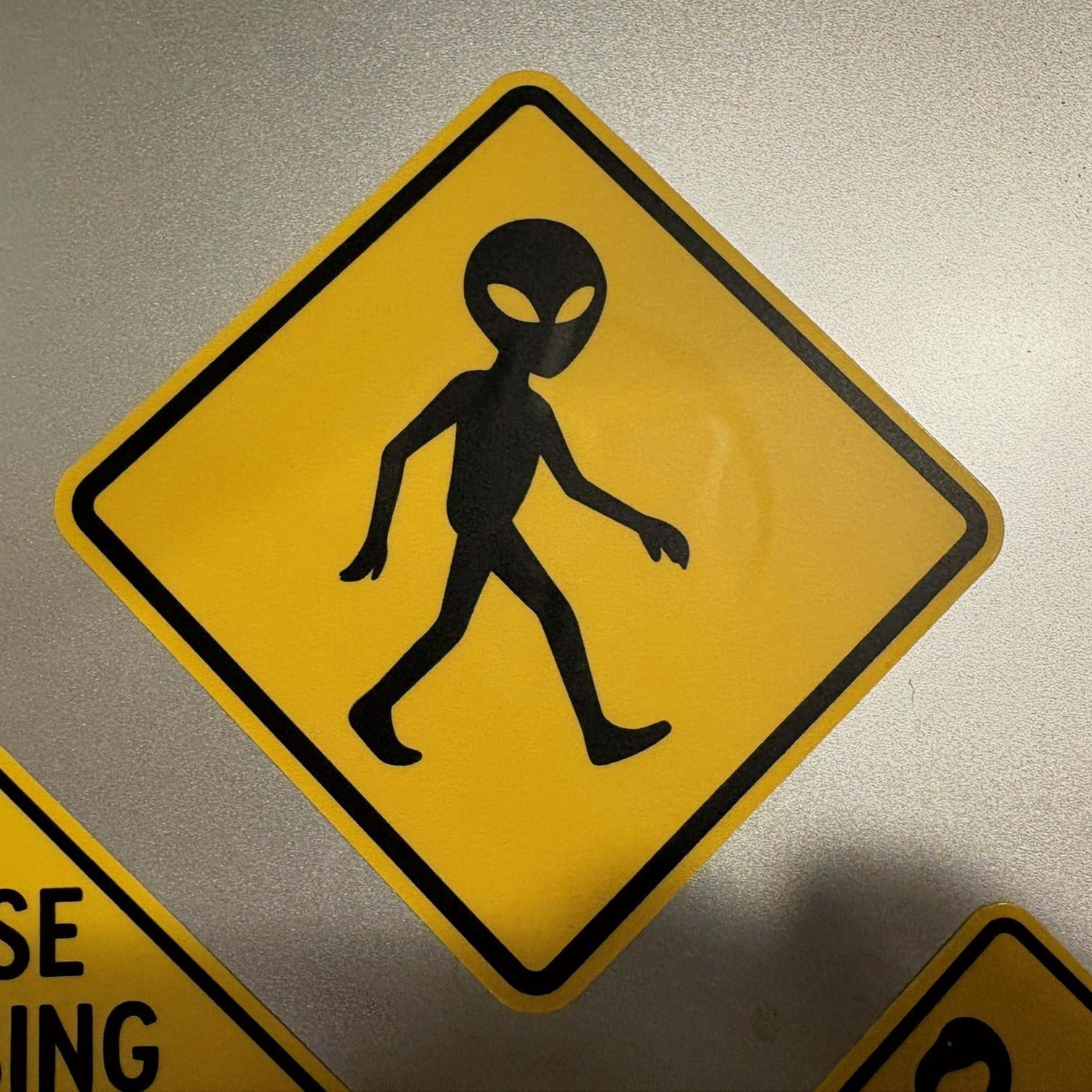 A warning from somewhere out of this world. Our Alien Crossing Sticker features a classic yellow diamond warning sign with a bold extraterrestrial silhouette, inspired by novelty roadside signs and sci-fi folklore.
