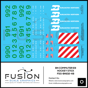 O Scale Burlington Northern Commuter E9 Hockey Stick Locomotive Decal Set. These high-quality, precision decals add an authentic touch to your locomotive, showcasing the iconic hockey stick design of the Burlington Northern Commuter E9 locomotives.