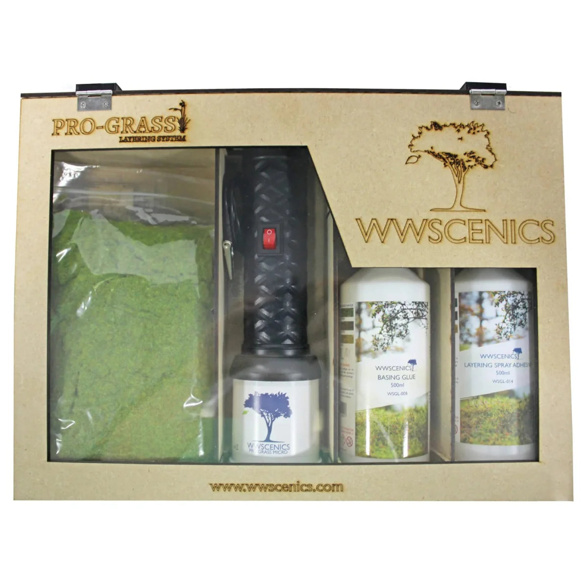 Take your modelling to the next level with the Pro Grass Layering System starter kit. WWScenics developed the Pro Grass Layering System to create unrivalled grassy landscapes for model scenery. This kit comes with everything you need to create your very own incredible terrain, using the method pioneered by us. Featuring a Pro Grass Micro Applicator, Basing Glue, Layering Spray, D-Baller tool, and a selection of static grasses to get you started on the next step in your modelling journey! Supplied in our own custom-made storage box, for secure and tidy storage.Â