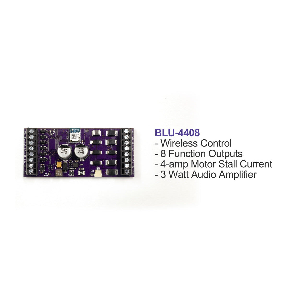 The BLU-4408 is designed to wirelessly operate models with higher stall currents such as some S, O, and large scale locomotives; this decoder features easy-to-use terminal blocks for no-fault wiring and a higher audio amplifier for awesome volume, indoors or out. Blunami decoders can be operated in three different ways: DC, DCC and Wireless mode. Using the Blunami app (iOS versions 8 or later), you can operate your locomotive with incredible ease of use. You will feel like you are in the cab with the amazing new features that Tsunami2 has to offer including: Reactive Dynamic Digital Exhaust, Functioning locomotive and train brakes, injectors, power reverse, and firebox flicker. We also offer a large selection of selectable sound effects including: exhaust chuffs(10), prime movers (up to 12), bells (12), Whistles (90), airhorns (40+), couplers, dynamos and more!