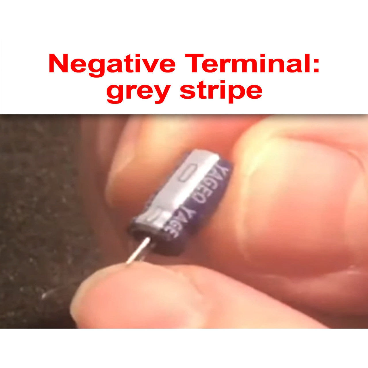 Capacitor Polarity: One side of the capacitor has a large grey stripe with a negative sign printed in it. This is how you can identify the negative terminal on the capacitor.